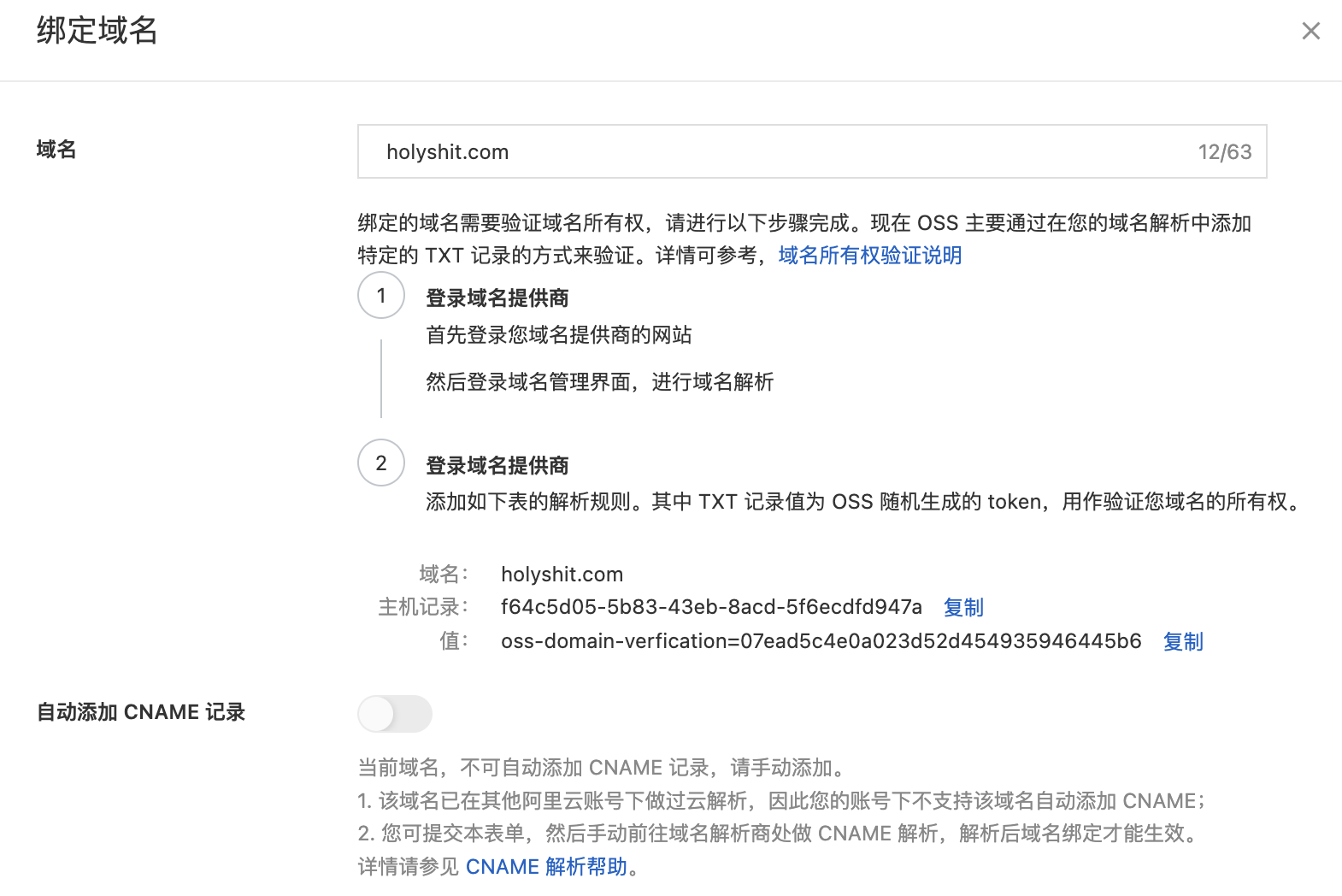 设置分为两部,第一步是验证域名的所有权,另一步是添加CNAME记录,就是将你的域名映射到默认域名。这里的验证和添加,都是到你的域名解析提供商那里进行配置。因为我把域名将解析放到了阿里云的云解析,我输入域名之后,它就自动识别了所有权,并且可以自动添加CNAME记录,所以几秒钟就搞定了,很方便。