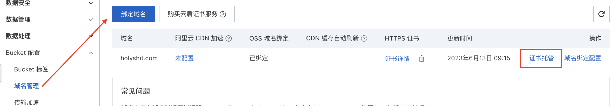 在申请证书的时候,也是需要进行验证的,就是搞个DNS记录,如果你的域名是放在云解析的,可以自动进行DNS验证,不用自己手动去填写了。有了证书再将证书配置到Bucket,找到刚才配置自定义域名的地方,点击“证书托管”,选择你刚才申请的证书就可以了。你也可以上传在其他地方申请的证书,不麻烦。
