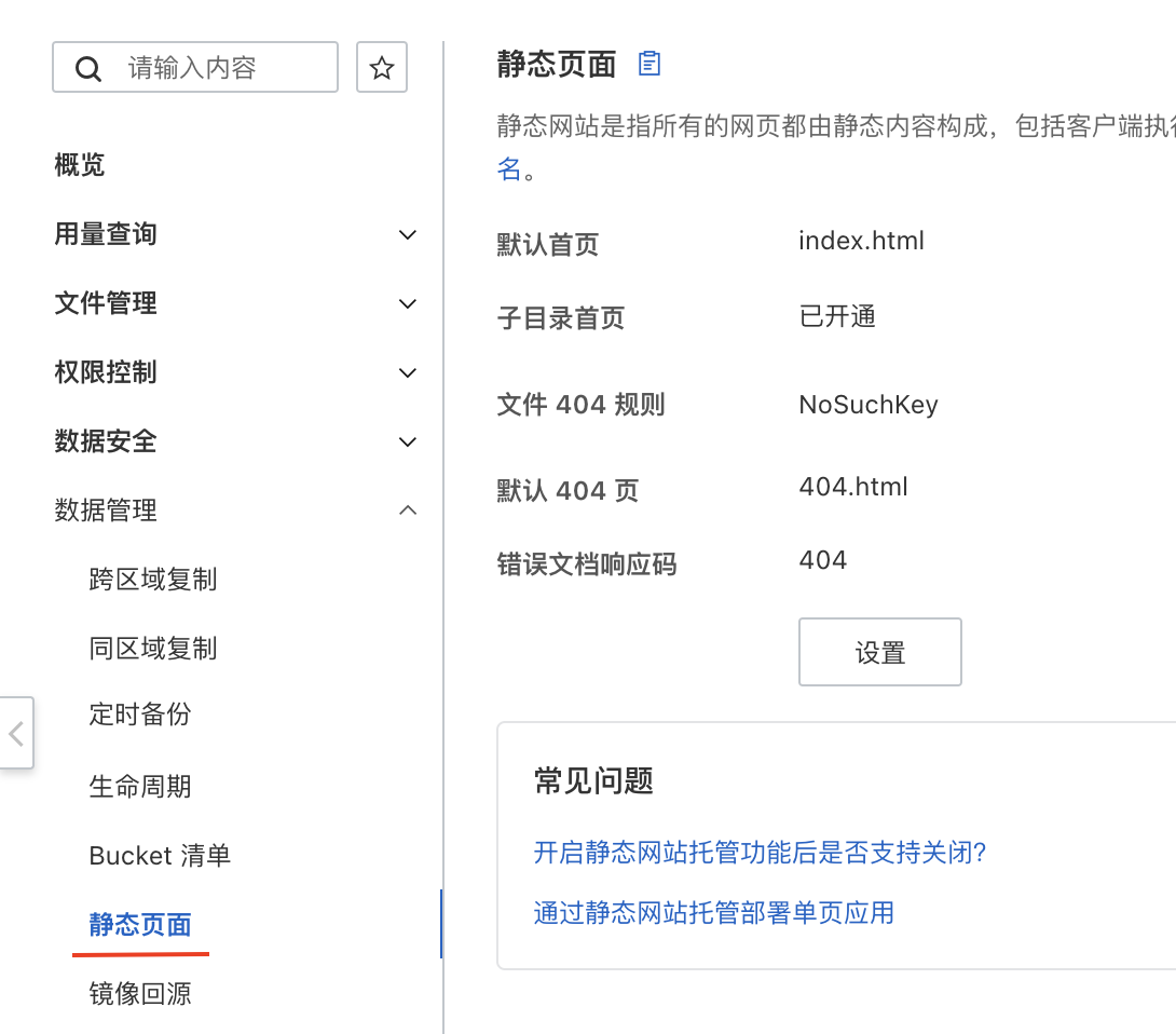 Bucket有了,然后需要微微配置一下,告诉阿里云我的这个Bucket是用来搭建静态站点的。你需要打开Bucket的管理页面,找到静态页面的配置项,如图所示: